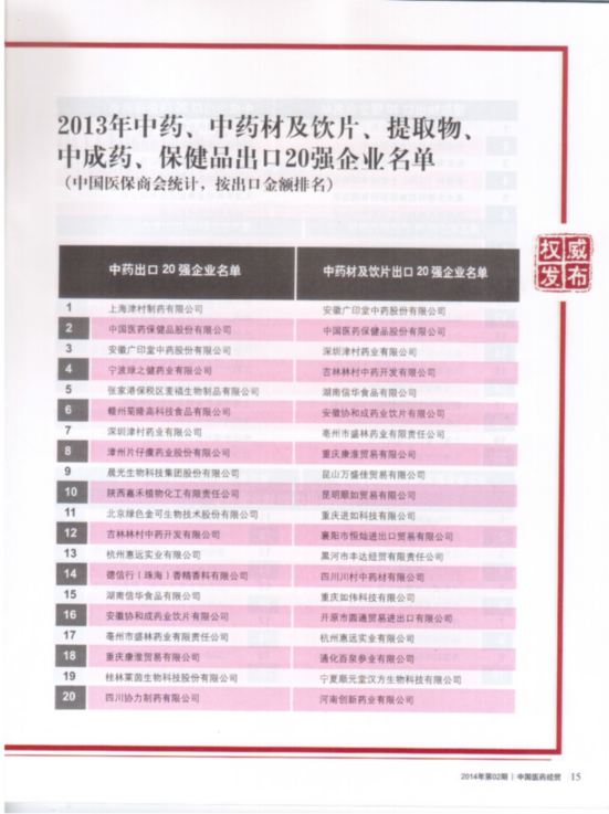 2013年,廣印堂中藥股份有限公司出口再創(chuàng )佳績(jì),名列中國中藥出口20強前三位,中藥材及飲片出口連續二年蟬聯(lián)全國第一名。